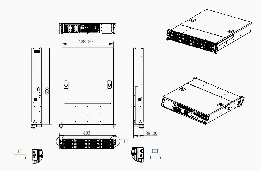 产品尺寸:W4382mm*L650mm*H88mm(含挂耳W482mm*L650mm*H88mm)